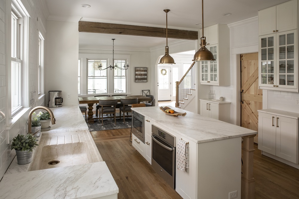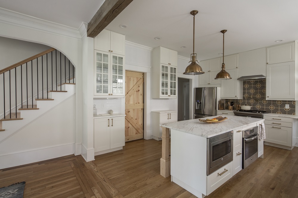 - To provide a better flow, the kitchen and dining room were opened up and the stairs were relocated